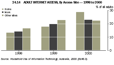An estimated 6.5 million adults in Australia (47% of all adults) accessed the Internet from any site (home, work or other site) at some time in 2000 (table 24.13). The comparable figure for 1999 was 5.6 million adults (41% of all adults). During 2000: