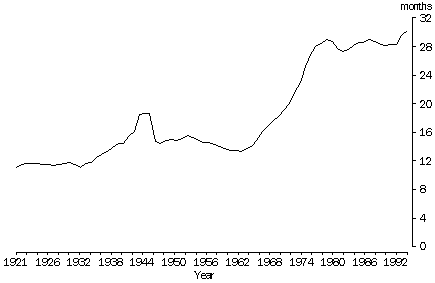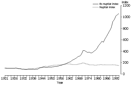 Source: Australian Demography; Births, Australia (cat. no. 3301.0) MEDIAN DURATION FROM MARRIAGE TO FIRST BIRTH Source: Australian Demography; Births, Australia (cat. no. 3301.0) Births outside marriage The first part of this review has focused on births within marriage. Until 1960 such births represented more than 95% of all births. However, the link between marriage and child bearing is weakening as de facto relationships become more common (see Australian Social Trends 1995, Trends in de facto partnering). Since 1960 the proportion of births which occurred outside marriage (ex-nuptial births) has increased steadily, reaching 26% in 1994. The indexes of nuptial and exnuptial births show the relative patterns of change in the numbers of nuptial and ex-nuptial births. Until 1960 the patterns had been similar, both increasing by about 70% overall since 1924. However, in 1961, when the contraceptive pill was first made available in Australia, the patterns began to diverge. Initially, use of the pill was largely restricted to married women. 'Some doctors were reluctant to prescribe for unmarried women unless they could justify a medical indication... advice to prevent pregnancy was considered immoral'4. Even in the Family Planning Associations the debate on whether to extend services to unmarried women and minors (people under the age of 21) continued until the 1970s. Between 1961 and 1971 the number of ex-nuptial births doubled while the number of nuptial births increased by 15%. For the next few years the number of ex-nuptial births declined slightly but started to increase again in 1978 along with the increasing number of de facto relationships. Because of the increasing number of births outside marriage and of births in second or subsequent marriages, analysis of fertility patterns based on births in the current marriage only no longer gives the full picture. Birth information collected by the Western Australian and Australian Capital Territory registries includes information on all previous births. In 1994, 42% of all women who gave birth in Western Australia and 43% of those in the Australian Capital Territory had their first baby. This is slightly higher than the 39% and 40% respectively of married mothers who had their first baby. BIRTHS OUTSIDE MARRIAGE Source: Australian Demography; Births, Australia (cat. no. 3301.0) INDEXES(a) OF NUPTIAL AND EXNUPTIAL BIRTHS (a) Base year 1924=100. Source: Australian Demography; Births, Australia (cat. no. 3301.0) CURRENT FAMILY SIZE(a), 1994