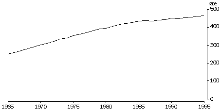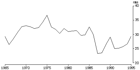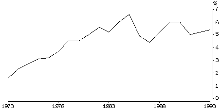 Source: Motor Vehicles in Australia (unpublished data). An ageing fleet The average age of passenger vehicles in Australia has increased. In 1995, the average age of passenger vehicles registered was 10.4 years. The corresponding average ages in 1993, 1991 and 1988 were 10.2, 9.7 and 9.1 years respectively. The ageing of motor vehicles has implications for emissions, fuel use and safety. 1985 was the most common year of manufacture of passenger vehicles registered at 30 June 1993. These vehicles accounted for 7% of all registered passenger vehicles. Unleaded fuel became mandatory for all petrol passenger and commercial vehicles manufactured after 1985. However, in 1993, 60% of all registered passenger vehicles may have still been able to use leaded fuel. PROPORTION OF PASSENGER VEHICLES REGISTERED(a) IN 1993 BY THEIR YEAR OF MANUFACTURE (a) Registered at 30 June. Excludes vehicles manufactured prior to 1973 and in 1993.Source: Motor Vehicle Census 1993 (cat. no. 9309.0). New registrations The ageing of the car vehicle fleet is associated with a decrease in new motor vehicle registrations. Between 1966 and 1975, new passenger vehicle registrations per 1,000 population gradually increased from 26 per year to 37. Between 1976 and 1995 there was an overall decrease from 33 per year to 29. However there were fluctuations in the second half of the 1980s with the lowest rates of new passenger vehicle registrations occurring in 1987 and 1988 (around 23 per 1,000 population). In 1995, registrations of new passenger vehicles totalled 527,149. The top five makes (Ford, Holden, Toyota, Mitsubishi and Hyundai) accounted for 75% of them. Their shares of the market were 22%, 20%, 16%, 10% and 7%, respectively. In 1995, registrations of new light commercial vehicles totalled 86,104. The top five makes (Toyota, Ford, Holden, Mitsubishi and Mazda) accounted for 90% of them. Their shares of the market were 33%, 20%, 19%, 11% and 6%, respectively. REGISTRATIONS(a) OF NEW PASSENGER VEHICLES PER 1,000 POPULATION (a) Data prior to 1972 refers to calendar year and data for 1972 and after refers to financial year.Source: Motor Vehicle Registrations (cat. no. 9304.0). Private cars In 1993-94, 51% of Australian households had one registered private car, 26% had two and 7% had three or more. 16% did not have any registered private cars. The number of registered private cars in households can be related to household size and income. Generally, households with the most people aged 15 or over had the most registered private cars. For example, the majority (64%) of households with two registered private cars had two household members aged 15 or over. 43% of households with three registered private cars had three household members aged 15 years or over and 49% of households with four registered private cars had four household members aged 15 years or over. The number of adults living in the household is often associated with higher household income. Multiple car registrations were more common among those households with higher incomes. 40% of households in the highest income quintile had two registered private cars and 20% had three or more. In comparison, 8% of households in the lowest income quintile had two registered private cars and less than 1% had three or more. 41% of households in the lowest income quintile had no registered private cars, compared to 6% of households in the highest income quintile. WEEKLY HOUSEHOLD INCOME BY PRIVATE CARS REGISTERED, 1993-94