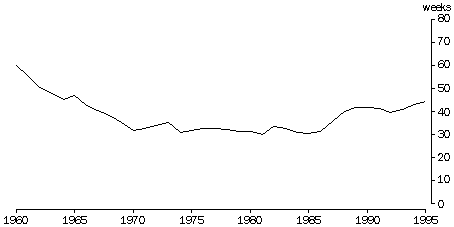 Source: Household Expenditure Survey (unpublished data). New car affordability It is difficult to estimate the change in affordability of new cars because of the introduction and deletion of models and the variation in models over time. However, the Ford Falcon base model sedan has been in continual production since its release in 1960. While successive models have become more technologically advanced, it has remained a six cylinder full-size family car. In 1960, it took 60 weeks at average male total weekly earnings to buy a new base model Ford Falcon sedan (excluding on-road costs). Over the next ten years the number of weeks of average male total weekly earnings required to purchase a new Ford Falcon declined to 32 weeks. From 1971 to 1986, this remained relatively constant. However, since 1987, there has been an upward trend, and in 1995 it took 44 weeks of average male total weekly earnings to buy a new base model Ford Falcon sedan. While it may appear that the affordability of a large family sedan in Australia has been declining since the mid 1980s, it should be noted that there have been dramatic changes in product quality over time. Later models have additional and improved features including greater safety, economy, performance, comfort and build quality. WEEKS OF AVERAGE MALE TOTAL WEEKLY EARNINGS REQUIRED TO BUY A NEW FORD FALCON(a) (a) Retail price of Ford Falcon for 1990 not available.Source: Ford Australia (unpublished data); Average Weekly Earnings (cat. nos 6301.0, 6350.0).