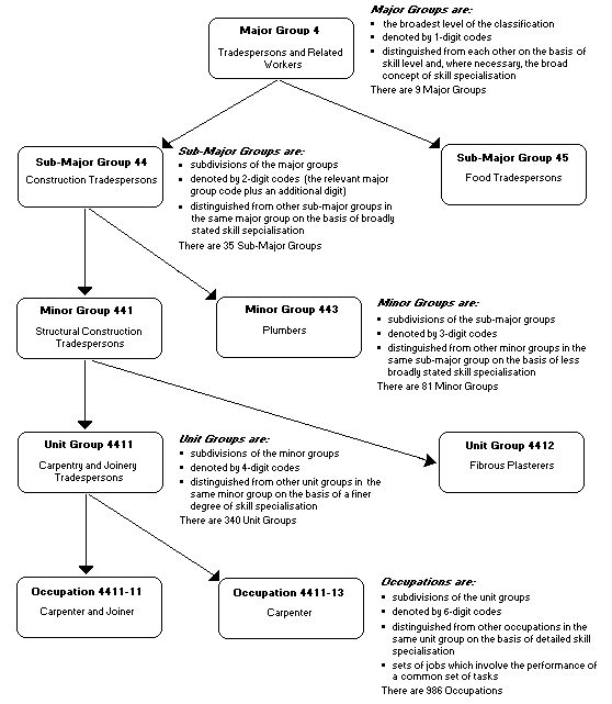 The above is an example of the hierarchy of ASCO. The classification also contains additional detailed descriptive information at each level and for each category. As well as providing an actual definition it includes information relating to occupations that may be included and excluded for each category at every level of ASCO.