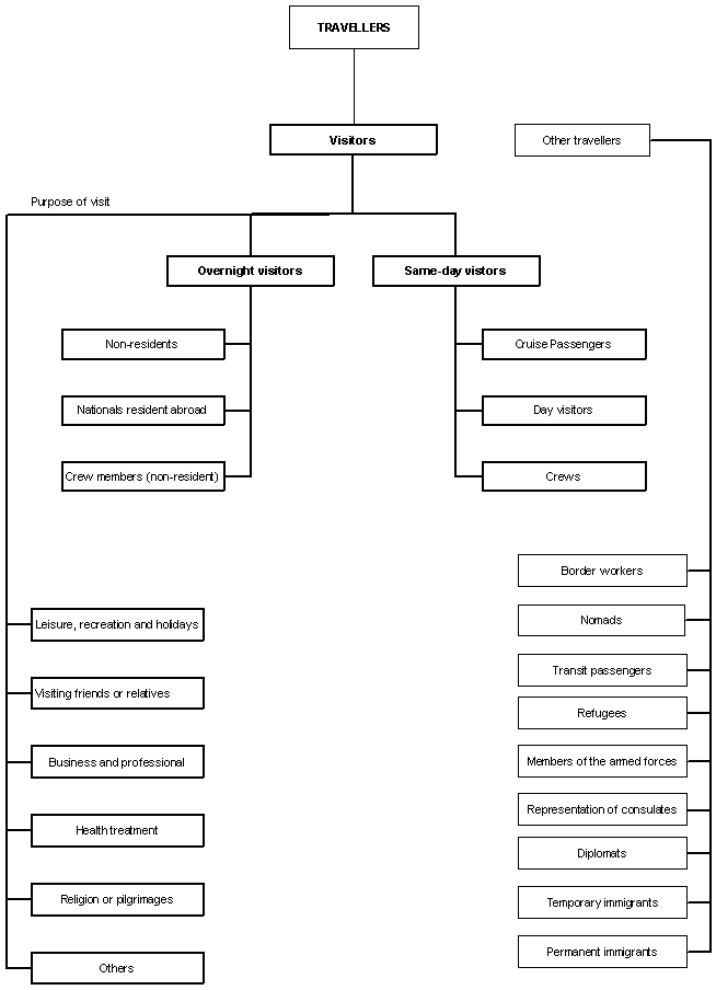 21. Travellers are further categorised into visitors and other travellers. The category 'visitors' provides the means for identifying those persons whose activities constitute tourism. The reason(s) travel is taking place (i.e. the purpose of visit) is also shown in figure 1. Travellers not classified as visitors are considered to be 'other travellers', whose activities do not constitute tourism.
