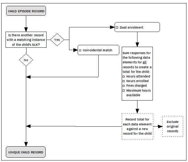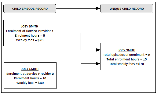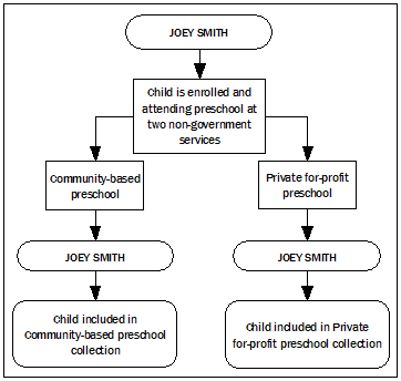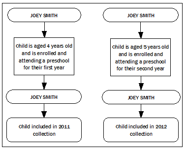 PROCESSING DATA FOR THE NATIONAL ECEC COLLECTION Figure 3.1: Child Episode Record to Unique Child Record For the purpose of reporting on hours enrolled, hours attended, maximum hours available and fees, child episode records are combined to obtain the total hours and total fees for children who are enrolled in multiple preschool programs. Identification of Unique Child Records Identification of unique child records can be achieved by application of a child/client database which contains detailed name, date of birth and address information for each child in a data set. Alternatively, a statistical linkage key (SLK) can be used to identify matching child records. Without a child/client database, the SLK can only provide estimated unique child records as it is possible for more than one child to have an identical SLK. For the National ECEC Collection, child records with identical SLKs were flagged and investigated by the jurisdiction in their child/client database. This process confirmed whether the matching SLK related to the same child enrolled in multiple preschool programs, or whether the SLK was a coincidental match (i.e. another child with a similar name). Alternatively, where a jurisdiction did not have a child/client database, matching SLKs were considered to be dual enrolments and combined accordingly into an estimated unique child record. The conceptual process which ensures that each child is only counted once for the total number of children enrolled and attending a preschool program is outlined in the diagram below. Figure 3.2: Creating a Unique Child Record Identification of Unique Child Records in the Year before Full-time Schooling Identification of unique child records in the YBFS can be achieved with 2 years of data collected using a URL data collection methodology and a child/client database. Where a child/client database is not available, the application of a SLK is used as an alternative unique identifier. For the National ECEC Collection, children who are enrolled for more than one year of a preschool program are identified and if these children are aged 5 or 6 years old, their records are excluded from the number of children in the YBFS. Four year old children who are enrolled in more than one year of a preschool program are not excluded because they would not have been attending a program intended for children in the YBFS in the previous year (i.e. they would have been attending as an eligible early entry child but not included in the count of children enrolled and attending in the YBFS). The conceptual process which ensures that each child is only counted once for the total number of children enrolled and attending a preschool program in the YBFS is outlined in the diagram below. Figure 3.3: Creating a Unique Child Record for the Year before Full-Time Schooling Concept For the 2011 National ECEC Collection, identification of unique child records using appropriate methods was achieved for some jurisdictions, however, for other jurisdictions it was not achieved. See Chapter 5, Jurisdictional Data Quality Statements for collection specific assessments. REASONS A CHILD COULD BE ENROLLED IN AND ATTENDING MULTIPLE PRESCHOOL PROGRAMS Below is a summary of the different ways that a child could be included more than once in the National ECEC Collection. Across jurisdictions When children move interstate during the reference period, they may still be on the enrolment list of their former preschool as well as on the enrolment list of their new preschool. In this situation, the child would be recorded legitimately in both jurisdictional data sets. In the 2011 collection this occurrence is significantly reduced, due to the alignment of collection reference periods for each jurisdiction. In 2011 the collection did not include any further reconciliation processes to further manage this occurrence Figure 3.4: Multiple Enrolments – Across Jurisdictions Cross border issues Where a child is enrolled in and attending two or more preschools in two separate jurisdictions (e.g. NSW and ACT), the child would be recorded in two different jurisdictional data sets. This could occur when a family uses a mixed preschool program delivery model that is located within different states/territories. Figure 3.5: Multiple Enrolments – Cross Border Issues This is an instance where a child is enrolled in and attending two preschools and subsequently this child would be included in both jurisdictional collections. Within a sector Where a child is enrolled in and attending two or more preschool programs within a sector, the child would be recorded for each enrolment within a jurisdictional data set. This could occur because a child’s family has decided to use two or more non-government services, two or more government services, or two or more LDCs, reflecting work life arrangements, or to increase their child’s preschool attendance hours. Figure 3.6: Multiple Enrolments – Within Sector When jurisdictions can collect data using a URL methodology and a child/client database and/or SLK is available, these records could be matched to produce a unique child record. Although this is an instance where a child is enrolled in and attending two preschools, this child should only be counted once within ‘Counts of Children’. Across sectors Where a child is enrolled in and attending two or more preschool programs across sectors the child would be recorded for each enrolment within a jurisdictional data set. This may occur because a child’s family has chosen to use a combination of government preschool, non-government preschool or preschool in an LDC, reflecting work life arrangements, or to increase their child’s preschool attendance hours. Figure 3.7: Multiple Enrolments – Across Sectors When jurisdictions can collect data using a URL methodology and a child/client database and/or SLK is available, these records could be matched and combined to produce a unique child record (See ‘Identification 