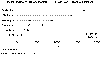 Natural gas has been the fastest growing primary energy over the twenty years 1978-79 to 1998-99 (graph 15.13). The growth rate for coal (black and brown) has also been above the overall trend, due primarily to the strong growth in electricity generation over the period (graph 15.14). The consumption of crude oil has also grown significantly, reflecting the heavy use of petroleum products in the transport sector. The annual growth in consumption of renewables has declined over the years (ANZMEC 2001).