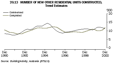 Whereas table 20.12 presented the number of new other residential dwelling units approved, commenced and completed in 2000, graph 20.13 shows a ten year time series of commencements and completions of these types of buildings ending with the December quarter 2000. It can be seen that the completions series generally has lagged the commencements series by one to two quarters, although this pattern has been less clear since the June quarter 1997.