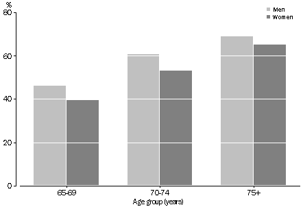 Source: Survey of Disabled and Aged Persons (1988); Survey of Disability, Ageing and Carers (1993) Living arrangements Responding to changes in government and community attitudes, recent programs have been designed to avoid premature or inappropriate admission to long-term residential care for older people or people with disabilities. Instead, basic support services have been developed to help people be independent at home and in the community. In 1993, 138,900 people aged 65 and over, 7% of the age group, lived in a health establishment of some kind. 95% of these institution residents had a disability and 87% also had a handicap, most of which were classified as profound. Of the 1.9 million people aged 65 and over living in households, 53% had a disability and 45% also had a handicap. People with a handicap living in households were less likely than those in institutions to have a profound or severe handicap; 28% were so classified. A further 22% were classified as having a moderate handicap. Overall, 96% of people aged 65-74 who had a disability lived in households, as did 80% of people aged 75 or more with a disability. Even those with a profound handicap were more likely not to live in institutions, although the proportion was reduced in the oldest age group. In 1993 about one-third of non-institutionalised people aged 65 and over with a disability lived alone, a slightly higher proportion than of those without a disability. Help with activities People with a disability living in households may nevertheless need help with one or more everyday living activities other than the primary areas of limitation. They may need help or supervision to carry out certain tasks, or might find it difficult to do the task alone. People without a disability may also have such difficulties and the need for help was increasingly reported as age increased. In 1993, 21% of people aged 65-69 without a disability needed some help with one or more activity, compared to 49% of those aged 75 and over. For people with a disability, the pattern of help needed was very similar but at a higher rate, 49% of those aged 65-69 and 78% of those aged 75 and over. People with a disability were most likely to need help with home maintenance, as were those without a disability aged 70 and over. Assistance with transport was important for both groups. HELP NEEDED BY PEOPLE LIVING IN HOUSEHOLDS, 1993