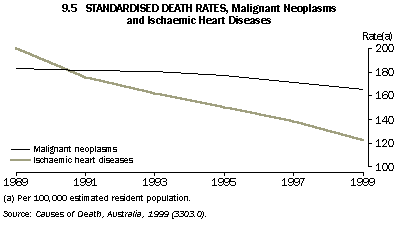 Examining deaths over the last decade, although the total number of deaths registered in 1999 was 3.1% greater than the number registered in 1989, the standardised death rate in 1999 (584 deaths per 100,000 population) was 23% lower than the corresponding figure in 1989 (759 deaths per 100,000 population). These figures are consistent with continuing improvements in life expectancy in Australia. Over the ten years to 1999, there were quite different patterns of decline in the two leading causes of death, malignant neoplasms and ischaemic heart diseases, which together account for nearly half the total deaths. Between 1989 and 1999, the standardised death rate for malignant neoplasms decreased 10%, while the rate for ischaemic heart diseases decreased 39%.