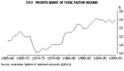 The highest recorded value of the wages share of total factor income was 62.4% in 1974-75. The wages share has recovered somewhat from its low value of 52.8% in 1988-89, but remains below the level recorded for most of the 1970s and early 1980s. In 1999-2000, the profits share of total factor income of 24.1% was slightly lower than its highest share of 24.3%, recorded in 1993-94, but remains at a relatively high level compared with earlier periods.