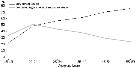 Labour force status Early school leavers were less likely to be employed and more likely to be unemployed or not in the labour force than those who had completed the highest level of secondary school. In 1994, 59% of early school leavers were employed, compared to 72% of those who had completed the highest level of secondary school. 8% of early school leavers were unemployed and 33% were not in the labour force. It is likely that the overall lower educational attainment of early school leavers affects their labour force status. In addition, the higher proportion of early school leavers who were not in the labour force as compared to those who had completed the highest level of secondary school is affected by the older age profile of the early school leaver population. In 1994, most people aged 55-69 (66%) were not in the labour force. There were substantial differences in labour force participation between women who had left school early and women who had completed the highest level of secondary school. Female early school leavers were less likely to be employed (47%) and more likely to not be in the labour force (47%) than women who had completed the highest level of secondary school (65% and 28% respectively). For men, the differences in labour force participation were not quite as marked. LABOUR FORCE STATUS, 1994