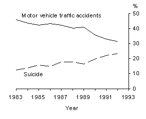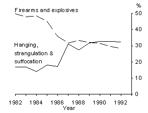 Years of potential life lost More than 230,000 years of potential life were lost as a result of suicide deaths of young Australians (aged 15-24 years) in the decade to 1992. The years of potential life lost from suicide have consistently increased as a proportion of the total from all causes of death, from 12% in 1983 to 23% in 1992. In contrast, the proportion of years of potential life lost as a result of deaths of young Australians due to motor vehicle traffic accidents has declined, from 46% in 1983 to 31% in 1992. YEARS OF POTENTIAL LIFE LOST(a), MALES AGED 15-24 YEARS (a) Suicides and motor vehicle traffic accidents as a proportion of all causes. Source: Causes of Death Sex differentials Men in general are four times more likely to commit suicide than women. In the 15-24 years age group men are more than five times more likely than women to commit suicide. There has been speculation on the reasons for such a marked sex difference in suicide rates. These include the links between unemployment and low self-esteem, particularly among young men2. A further hypothesis is that at least part of the difference is due to a higher success rate among men, who often use more violent means3. Methods of suicide In 1972, the leading method of suicide for young men was using firearms or explosives (44%). However, by 1992, suicide by hanging, strangulation or suffocation had become their leading method of suicide (33%). The shift in method occurred in the mid to late 1980s. During this period the death rate for young male suicide by firearms and explosives decreased marginally, from 9 to 8 per 100,000, while the rate for suicides by hanging, strangulation and suffocation increased substantially, from 3 to 8 per 100,000. These data contradict much of the recent literature which has focused on the greater use of firearms as the cause of the increase in young male suicides. In contrast, the most prevalent method used by young women was poisoning by solid or liquid substances, accounting for 29% of cases in 1988-92. Although the incidence of suicide from hanging, strangulation and suffocation also increased among young women during the mid to late 1980s the corresponding rate was much lower than that of young men (less than 2 per 100,000). Firearms were used in 13% of cases and hanging, strangulation and suffocation in 24%. Support for the argument that the higher male suicide rate is due in part to their success rate comes from hospital separations data. In both Queensland and South Australia (the only two States for which data are available) female separation rates for attempted suicide or self-inflicted injury are similar to male separation rates. This could be interpreted as an indication that men and women actually attempt suicide or other self- destructive acts at approximately the same rate and that it is the higher success rate among men which leads to their higher completed suicide rate. However, without further detailed research this conclusion must be treated as speculative. SELECTED METHODS OF SUICIDE, MALES AGED 15-24 YEARS Source: Causes of Death METHODS OF SUICIDE, 1988-1992