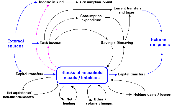 2.3. Economic well-being is determined by all economic resources available to the household. It encompasses the household's access to goods and services through its current income and its capital receipts whether they are received in cash or in-kind. It also includes the notional dissaving value of the household's net stock of assets and liabilities, otherwise referred to as the household's net worth. Economic well-being can be viewed either from the receipts side i.e. the household's capacity to consume and save, or from the consumption side i.e. the household's actual consumption and its method of financing this consumption.