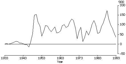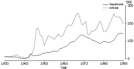 Trends in migration Immigration to, and emigration from, Australia have grown in the post-war period, although there have been significant fluctuations. In the period there have been three major waves of immigration to Australia, the first peaking in 1950 when 175,000 people migrated to Australia. This was primarily due to the displacement in Europe caused by World War II, and to Australian government policies encouraging growth. The second significant wave of immigration to Australia peaked in 1970, when 259,000 people migrated to Australia. The third wave of migration peaked in 1988, when 254,000 people migrated to Australia. Emigration has been much less volatile than immigration. Emigration increased steadily after World War II until 1972. This peak, two years after the peak in immigration, was primarily because large numbers of settlers who arrived in the 1970 wave returned to their country of birth. Emigration peaked again in 1991 and 1992, three to four years after the peak in immigration. In the 1990s there have been record levels of emigration with more than 140,000 departures each year since 1991. This is, in part, due to the high level of immigration in the late 1980s (see Australian Social Trends 1994, Emigration). Category jumping has become a much larger component of net overseas migration since the late 1980s. The net gain due to category jumping of 24,000 in 1988 was nearly double the previous record net gain of 13,000 in 1977. Similarly, the net loss of 25,000 people through category jumping in 1992 was more than four times the pre-1991 record loss of 4,200 in 1978. Net overseas migration has been quite volatile in the post-war period. The major fluctuations have generally followed the pattern of immigration with peaks in net migration occurring around the same time as peaks in immigration. MIGRATION PATTERNS