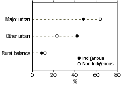Location of households In 1999, approximately 82% of the Indigenous population and 99% of the non-Indigenous population lived in non-remote areas. Two thirds of these Indigenous households were located in New South Wales and Queensland. Information about Indigenous housing in remote areas can be found in Australian Social Trends 2000, Housing in remote Aboriginal and Torres Strait Islander communities. The majority of both Indigenous and non-Indigenous households in non-remote areas were located in urban areas (91% and 88% respectively), although Indigenous households were less likely to be found in major urban areas (48% compared with 64% of non-Indigenous households). A lower proportion of Indigenous households (9%) were in non-remote rural areas compared with non-Indigenous households (12%). LOCATION OF HOUSEHOLDS, 1999 Source: 1999 Australian Housing Survey, Aboriginal and Torres Strait Islander Results (ABS cat. no. 4712.0). Household composition The composition of a household is generally related to the age and stage of life of its members. Many of the reported differences in household composition between Indigenous and non-Indigenous households can be attributed to the younger age profile of the Aboriginal and Torres Strait Islander population (stemming from their higher fertility rate and lower life expectancy). For more information see Australian Social Trends 2000, Social conditions of Aboriginal and Torres Strait Islander people. Couples with children made up 40% of Indigenous households in non-remote areas, compared with 33% of non-Indigenous households. The proportion of one-parent families was also higher in Indigenous households (15%) compared with non-Indigenous households (8%). Aboriginal and Torres Strait Islander people were less likely to be living alone (17% of households) than non-Indigenous people (24% of households). However, the lower proportion of lone-person households in the Indigenous population can be partly attributed to their younger age profile, as nearly half of the non-Indigenous people living alone were aged 60 years and over. The proportion of group households was similar for both the Indigenous (5%) and non-Indigenous (4%) populations. HOUSEHOLD COMPOSITION AND DWELLING UTILISATION, 1999