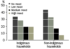 Housing utilisation and condition Housing utilisation is an indicator of crowding in a dwelling, calculated according to the number of bedrooms available to a household in proportion to its size and composition (the ABS has used the Canadian National Occupancy Standard as a model as it is considered to conform reasonably to social norms in Australia). As overcrowding can accelerate the deterioration of a dwelling and aggravate environmental health problems,1 the reported level of housing utilisation can reflect the quality of a household’s housing conditions. In 1999, Indigenous households in non-remote areas had a higher average number of usual residents (3.3) than non-Indigenous households (2.6). However, this was lower than the 3.6 persons per Indigenous household reported in the 1991 Census. While the majority (95%) of Australian households had enough bedrooms for their needs, 13% of Indigenous households needed more bedrooms to adequately accommodate all members of the household (compared with 4% for non-Indigenous households). Over 87% of the Indigenous households needing more bedrooms were renting their dwelling. Indigenous households in non-remote areas were also more likely than non-Indigenous households to report that their dwelling was in need of repair (interior and/or exterior), especially if they lived in a rented dwelling. Overall, 20% of Indigenous households reported that their dwelling was in high need of repair (26% for those renting) compared with 7% of non-Indigenous households (13% for those renting). NEED FOR REPAIRS TO DWELLING, 1999 Source: 1999 Australian Housing Survey, Aboriginal and Torres Strait Islander Results (ABS cat. no. 4712.0). Nature of occupancy In 1999, Indigenous households in non-remote areas were more likely to be renting their home (58%) than non-Indigenous households (27%). Of those Indigenous households which rented, 39% were renting their home from a State housing authority, compared with 18% of non-Indigenous households which rented. In 1999, 39% of Indigenous households either owned or were purchasing their own home, compared with 71% of non-Indigenous households. The proportion of Indigenous households which owned their home outright was also much lower (13%) than for non-Indigenous households (39%). As household tenure is closely associated with age, it is likely that the younger age profile of the Aboriginal and Torres Strait Islander population is at least partly responsible for their higher proportion of renters and lower proportion of home owners. Applying (age) standardisation allows a more valid comparison of types of tenure, by presenting the rates which might occur if both populations had the same age profile as the overall Australian population. Using standardised figures, 43% of Indigenous households in non-remote areas were home owners or purchasers, compared with 71% of non-Indigenous households. While the proportion of Indigenous households owning their dwelling outright was similar to the proportion of Indigenous households with a mortgage (21% and 22% respectively), a larger proportion of non-Indigenous households owned their home outright (39% compared with 32% with a mortgage). After standardisation, there was still a higher proportion of renters in the Indigenous population (46%), compared with the non-Indigenous population (26%). Similar proportions of Indigenous and non-Indigenous households were renting from private landlords (19% and 20% respectively), but a higher proportion of Indigenous households were renting from a State housing authority (23% compared with 5% for non-Indigenous households). HOUSEHOLD TENURE, 1999