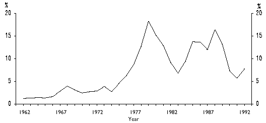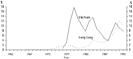 Source: Overseas Arrivals and Departures. The post-war period At the 1947 Census, one-tenth of Australians had been born overseas and of these, 81% had been born in English speaking countries. At the 1991 Census, one-quarter had been born overseas, 42% in English speaking countries. This change was accompanied by increasing diversity of the birthplaces represented in Australia. At the 1947 Census the five most common countries of birth (UK & Ireland, New Zealand, Italy, Germany and Greece) accounted for 87% of overseas born Australians. At the 1991 Census, the five most common countries of birth were UK & Ireland, New Zealand, Italy, Yugoslavia and Greece but these accounted for only 53% of overseas born Australians. The UK & Ireland, historically Australia's major source of settlers, remains the single most common country of birth of immigrants although its contribution has been reduced significantly, from 73% in 1947 to 42% in 1961 and 31% in 1991. From the 1960s to the mid-1970s, settlers born in the UK & Ireland made up almost half of total settler arrivals. In 1965 and 1966, there were more settlers from UK & Ireland than from the rest of the world put together. Since the mid-1970s, however, the number of settlers from the rest of the world has increased substantially (reflecting Australia's broadening immigration policy) while the number from UK & Ireland has remained relatively steady. Of the 1992 intake of settlers, 12,300 had been born in the UK & Ireland and 82,000 in the rest of the world. Apart from the UK & Ireland, the other major source countries of settlers have changed markedly in the last 30 years. In the early 1960s, European countries particularly Italy and Greece predominated, and the six most common countries of birth accounted for 80% of settler arrivals. By the early 1970s, USA and New Zealand were represented in the top six countries, which in total accounted for 63% of settler arrivals. In the late 1970s Viet Nam began to become an important source of settlers and in the period 1981-85 was ranked third. The most recent period (1988-92) has seen a continuation of migration from Asia with four of the top six source countries in being Asian. SETTLERS BORN IN NEW ZEALAND Source: Overseas Arrivals and Departures. SETTLERS BORN IN GREECE AND ITALY Source: Overseas Arrivals and Departures. SETTLERS BORN IN VIET NAM AND HONG KONG Source: Overseas Arrivals and Departures. Selected countries Migration between Australia and New Zealand has always been unrestricted. In the post-war period to the mid-1960s, much of the trans-Tasman migration was the onward migration of British settlers4. At that time, Australia's intake of people born in New Zealand was low. Since then there have been three distinct waves of immigration of the New Zealand born. From the mid-1970s, the intake rapidly increased to a high of 18% of Australia's immigration program in 1979. In the early 1980s the intake fell but rose in 1985 and again in 1988. In 1992, 8% of Australia's settlers had been born in New Zealand, representing an outflow of 2,000 per million (or 1 in 500) of the New Zealand population. Italy and Greece both provided many of the settlers who came to Australia in the 1960s. However immigration of people born in these countries tapered off during the 1970s and 1980s and in 1992 the combined proportion of settlers born in these countries was less than 1% of the total intake. The number of settlers born in Viet Nam increased dramatically in the 1970s and 1980s with refugees leaving Viet Nam during and after the Viet Nam war. Before 1976 Viet Nam was not separately recorded as a country of birth for settlers so it is not possible to get an exact picture of settler intake prior to this time. However, there have been three peak periods for Vietnamese settling in Australia. The first was the initial intake of refugees in the late 1970s. The second, in 1983-84, was most likely a result of the 1982 agreement between the Australian and Vietnamese governments (the Orderly Departure Program) which allowed relatives of Vietnamese Australians to leave Viet Nam and migrate to Australia. The third peak in the late 1980s seems to have been mainly due to the family reunion scheme. Vietnamese born settlers accounted for 8% of all settlers who arrived in 1992 and represented an outflow of 100 per million of that country's population. In 1991 Hong Kong overtook Viet Nam and New Zealand as the second largest source of settlers. In 1992 settlers born in Hong Kong made up 10% of the total number of immigrants to Australia and represented an outflow of 1,700 per million of Hong Kong's population. It is expected that the prominence of Hong Kong as a major source of settlers is temporary as many citizens are choosing to leave prior to the reversion of government to China in 1997. TOP SIX SOURCE COUNTRIES OF BIRTH OF SETTLERS, 1992