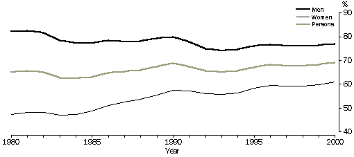 Between 1980 and 2000, trends in the employment rate for people aged 15-64 years, including those of youth, women, families and older workers reflected underlying changes in society. For example, changes in the traditional roles of full-time employment for the male partner, and child care and household responsibilities for the female partner, began around the 1960s and gained momentum over the 1980s and 1990s. These were associated with a shift away from a male-dominated workforce to one where women were participating to a greater extent, leading to converging employment rates for men and women. EMPLOYMENT POPULATION RATIOS FOR PERSONS AGED 15-64 YEARS Source: ABS Labour Force Surveys, July 1979 to June 2000. The period between 1980 and 2000 was also characterised by major changes to industry and workforce structure. Employment growth was concentrated in the service sector and a rise in the number of part-time and casual jobs was offset by a corresponding fall in the number of more traditional permanent full-time jobs (see Australian Social Trends 2000, Employment arrangements in the late 1990s). In keeping with these trends, various employment population ratios for people aged 15-64 years changed over this period. Part-time employment rates increased from 11% in 1980 to 17% in 2000, while casual employment rates increased from 13% in 1990 (the first year data were available) to 16% in 2000. Between 1980 and 2000, the permanent full-time employment rate fell from 56% to 52%. However, despite these changes, almost three quarters of all employed people were in permanent full-time positions in 2000. SELECTED EMPLOYMENT POPULATION RATIOS