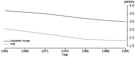 Between 1961 and 1991 the number of dwellings in Australia more than doubled, from 3.0 million to 6.5 million. Over the same period the population increased by about 60%. The average number of occupants per dwelling has thus decreased from 3.6 in 1961 to 2.8 in 1991. Decreases were recorded for all types of dwelling and mainly reflected demographic changes in the structure of the population and of families. With the total fertility rate down from 3.6 children per woman in 1961 to 1.9 in 1991 (see Family - National summary tables), families now have, on average, fewer children. In addition, there has been an increase in the proportion of one parent families which are on average smaller than other types of families. Finally, the ageing of the population has led to an increase in the number of older people who live alone.