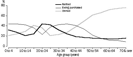Children are most likely to live in houses being purchased, reflecting the tendency of young Australian families to start buying their own homes. In their late teens and early 20s people tend to leave the parental home and start renting. In their 20s and 30s people are likely to start buying their first home and in their 40s and 50s to pay off their mortgages. In 1991, by age 50 years, over half the population lived in homes owned by a member of their household, usually themselves or their spouse. At age 65 years, this had increased to 75%.