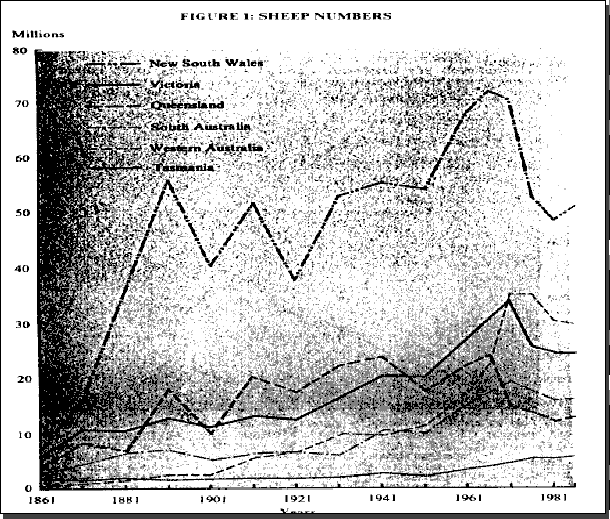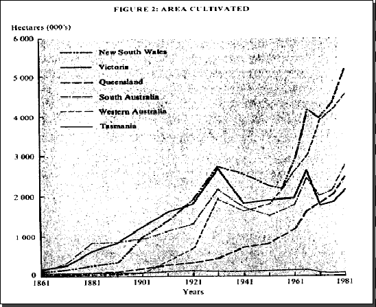 1. 1788-1820 During this period, the colonists of New South Wales and Van Diemen's Land struggled to provide even basic food requirements. They were not always successful in the earlier years and chronic hunger was not uncommon. Lack of agricultural experience, capital equipment of the most rudimentary kinds and of draught animals were complemented by an unknown environment. Towards the end of this period the economic potential of sheep was beginning to be appreciated by Marsden, Macarthur and others, with irregular wool and tallow exports. Exploration, of what proved to be better and far more extensive pastoral lands west of the Dividing Range and the interior of Van Diemen's Land, began in this period. The most important cultivation lands were the Windsor, Parramatta and Liverpool districts near Sydney where wheat and maize were the major crops. Sheep and cattle grazing were concentrated in the Cumberland basin and the south-east of Van Diemen's Land. 2. 1820-1860 This phase was characterised by rapid expansion both of the pastoral industry across Australia and wheat cultivation along the gulf seaboard of South Australia. Elsewhere, grain cultivation stagnated for three reasons: transportation problems were considerable (there were few roads capable of supporting grain laden wagons between the newly settled lands and exporting ports); soils of the older settled areas showed alarming declines in fertility after three to five years of cropping; and wheat varieties particularly suited to the climates of the colonies were not available. However, by the end of this period, draught animals were more plentiful, and manures provided some soil improvement; cultivation and harvesting techniques and machinery suitable for Australian conditions had been developed, for example the wheat stripper; and greater numbers of small farmers or 'dungarees' were turning to wheat cultivation both for export, and throughout the 1850s, to meet an increasing domestic demand. This period includes three very important changes to the structure of the colonial economies: the cessation of convict transportation; the development of free settler colonies with varying policies for land pricing; and the start of the gold rushes which brought both population and economic wealth to Victoria and New South Wales and later to other colonies. Each had profound effects on Australian colonial agriculture, varying from labour shortages and rapid regional increases in demand for foodstuffs, to long-term land marketing arrangements. By the end of 1860, the combined colonies possessed some 20 million sheep and 4 million cattle, and had almost half a million hectares under cultivation, half of which was wheat. At the end of this period, the broad pattern of Australian dryland agriculture was well towards the making. 3. 1860-1900 From the early 1860s to around the turn of the century the broad pattern of Australian land use was firmly established through the closer settlement Acts such as the Robertson Acts of New South Wales. In this period, a suitable land and water transportation system, was developed for the movement of agricultural products from source of production to the European and especially British markets. Australia became an important exporter of a wide range of agricultural products: wool, wheat, mutton, beef, fruit, sugar and dairy products. Cattle numbers for the continent doubled in this period with increases of between nine and ten-fold in Queensland and Western Australia. Sheep numbers increased three and a half times for all the colonies with a nine-fold increase in Western Australia and a six-fold increase in New South Wales (see Figure 1). The area cultivated increased around seven and a half- fold for all colonies between 1860 and 1900 with notable increases of over nine-fold in New South Wales and Queensland and over eight-fold in Victoria and Western Australia (see Figure 2). With the exceptions of Queensland and Tasmania, wheat sowings were responsible for most of the increases in cultivated area. In this period, New South Wales and Victoria increased their areas sown to wheat twelve-fold and South Australia and Western Australia, six-fold. 4. 1900-1950 The broad geographic pattern of Australian agriculture did not alter radically during the first half of the twentieth century. The severe drought in eastern Australia which began in the last years of the nineteenth century continued into the new and, combined with the rabbit plague, wreaked havoc on the agricultural economies of the eastern States. There were also notable regional droughts in the 1930s and 1940s and these, with the Great Depression and World War II, had severe impacts on the regional structure of agriculture, although not its geographical pattern. In particular, the economic depression and the droughts of the 1930s reduced many land holders to penury. During the period 1900 to 1950, there were general agricultural adjustments in regions of harsher physical environments and livestock densities were permanently reduced throughout much of semi-arid Australia. At the same time there was a retreat from the drier margins of agricultural lands. But in all, this was a period of consolidation, based on the reconciliation of a relatively stable technology with a now reasonably well known environment. The two World Wars brought both benefits and problems. They reduced the supply of labour and capital for agriculture but increased the demand for its products. At the end of World War II there were large quantities of American ex-army equipment available which radically altered the level of mechanisation on Australian farms. Despite setbacks from droughts, wars and economic depressions, national livestock numbers increased notably from 1900 to 1950, although not nearly as rapidly as in the previous period. Australian cattle numbers increased by 69% and sheep numbers by 60%. Only in the Northern Territory were these increases of the magnitude experienced els