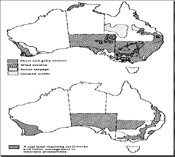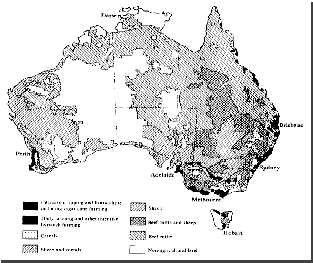 A large part of the Australian continent is not particularly suited to agricultural production in comparison with the land resources of other major agricultural producers. This is mainly due to the seasonality and limited rainfall of the continent combined with very high rates of potential evaporation, and to prolonged droughts which periodically affect most parts of the Australian continent. The vast interior of the Australian continent receives little rainfall in either winter or summer (less than 300 mm a year). This, combined with very high potential evaporation (in excess of 3,000 mm a year from a standard pan in which water is available at all times), means that in most years and in most seasons there is a soil moisture deficit. At best, this part of Australia may be used for extensive livestock grazing. As the northern portion of the continent receives almost all its rainfall (400-1,200 mm) during the hot summer months when evaporation is greatest (2,800-3,200 mm a year pan evaporation), it is less effective for plant growth than in the south of the continent. Generally, there is a severe dry period during the winter, with a consequent need for irrigation for any cropping. The exception is the very high rainfall 'sugar coast' of Queensland which receives more than 1,600 mm of rainfall and has less than 1,600 mm pan evaporation. The southern portion of the continent receives most of its rainfall (400 -1,200 mm) during the cooler winter months when pan evaporation is usually less than 1,600 mm a year. Consequently there is more soil moisture available for plant growth for a given amount of rainfall than in the north, especially during the wet winter season, when even relatively dry lands may be used to grow cereal crops. The eastern coastal zone receives more rainfall than most other parts of the continent (800 - 1,600 mm a year) and has relatively low pan evaporation (less than 1,600 mm a year). This rainfall occurs during all seasons giving a potential growing season longer than for most other parts of Australia. Because of the rugged terrain and cooler temperatures of the eastern highlands, land use is highly varied, ranging from wilderness to intensive cropping and horticulture. The Australian climate is also well known for its periods of low rainfall or drought which severely reduce the production of crops and animal forage and expose soils to erosion. Between 1965 and 1980, almost all of southern Australia experienced drought conditions, i.e. received less than the 10 percentile long-term rainfall for between 30 per cent and 40 per cent of all months. At the commencement of European settlement these broad climatic patterns and limitations were unknown. The range and seasonal variability of the continent's regional climates had to be learnt and appreciated, often by bitter experience. Over the past 150 years, cropping activities were often extended well beyond sensible climatic limits, occasionally causing such hardship and environmental damage that government decrees were enacted to limit the geographical extent of cultivation. In South Australia, for example, Goyder's Line was defined in 1865, while in New South Wales the non-agricultural Western Division was designated in 1901. Within those lands climatically suitable for agriculture, local areas of steeply sloping lands, or lands with particularly fragile soils impose further restrictions on the pattern of land use. In the past, there was very little appreciation of these limitations of the Australian land resource. Very steeply sloping lands were often cleared for grazing and, worse still, foe cultivation which led to widespread and severe erosion in areas such as the Southern Tablelands of New South Wales. In the southern pastoral lands where shrub vegetation, 'saltbush' and 'bluebush' provided forage for sheep and cattle, lack of understanding of annual rates of shrub growth led to gross overstocking which, in conjunction with depredation of huge rabbit populations, precipitated very serious losses of vegetative cover and consequent serious soil erosion. Much of western New South Wales for example, which suffered from these depredations, has never fully recovered and sheep numbers today remain well below those at the turn of the century. Limitations on land for agriculture may be defined in terms of land capability. Most States are now completing land capability mapping for their agricultural lands, assisting land users to avoid mistakes of the past. But land users are frequently unwilling or unable to change land use practices. Sometimes this is because of difficult economic circumstances; at other times it is because land users have little or no understanding of the long-term consequences of their activities. Information on the harmful effects of certain land use practices has often been ignored with consequent serious long-term effects. Dry land salinity was observed and explained in terms of extensive clearing of native woodlands in Western Australian wheatlands in the mid-1920s, and Victoria in the early 1960s; rising water tables and salinity led to the abandonment of a number of early irrigation areas along the Murray River around the turn of the century; and the serious long-term consequences of rising water tables in the Murrumbidgee Irrigation Area have been known since the 1950s. THE HISTORICAL DEVELOPMENT OF AUSTRALIAN AGRICULTURE Australian agriculture has passed through the following five broad phases in its continuing evolution since 1788.