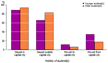 INTRODUCTION Higher education refers to education which usually results in the granting of a Bachelor Degree or higher qualification. Participation in higher education is considered a milestone by many people. It is a rich source of new talent and ideas, and helps to shape future leaders. Higher education contributes to Australia's intellectual, economic, cultural and social development, and the long term prosperity of Australia will be influenced by the future activities of higher education graduates. Studying for a higher education qualification can be a time of significant transition, where students learn new skills, gain knowledge, meet new people and are exposed to alternate ways of thinking. For those who recently left secondary school, the higher education experience may involve many firsts, such as moving out of their childhood home and living in a new city or town. Older students may face challenges like balancing their studies with work and family commitments. A higher education qualification can allow a person to gain an advantage in a competitive labour market and open up new professional opportunities, especially for careers where a qualification is required for employment or practice. On average, graduates earn more than other workers and the unemployment rate for graduates is lower than for the rest of the population. This article explores the characteristics of people who were enrolled at a higher education institution, and focuses on the different characteristics of younger students (aged 15-24 years) and older students of working age (aged 25-64 years). Very few people older than 64 years were enrolled in higher education (less than 1%). In 2012, although the majority of higher education students discussed in this article were studying for a Bachelor Degree qualification or above, 11% were studying for a qualification below a Bachelor Degree level, such as a Diploma, or were participating in other studies such as a bridging course. WHO ARE THEY? Although the number of higher education students rose between 2001 and 2011, the proportion of students remained relatively stable. In 2011, there were approximately 929,000 people enrolled in higher education in Australia, an increase from 719,000 people in 2001. In both years, 6% of the population aged 15-64 were higher education students. Most higher education students were aged 15-24 years The majority of higher education students began their course directly, or relatively soon after finishing secondary school. In 2011, around three in five (59%) students were aged between 15 and 24 years, while 41% of students were aged 25-64 years. NUMBER OF HIGHER EDUCATION STUDENTS(a) BY AGE - 2011 (a) Aged 15-64 years. Source: ABS 2011 Census of Population and Housing More women were studying Since 1987, women have outnumbered men in higher education. By 2011, 57% of higher education students aged 15-64 years were women. A number of reasons for this change have been proposed, including the improved social position of women, and the fact that entry into some occupations in which women have traditionally had high levels of participation (for example, teaching and nursing) now requires a degree qualification. (Endnote 1) The proportion of students born overseas is rising Students from many different backgrounds study in higher education, and international students contribute to this diverse group. International students enrich Australian communities, bringing energy and different points of view, and they expand Australia's global networks by linking Australians to the rest of the world. (Endnote 2) Higher education is also a significant export industry for Australia - in 2010, fee income from international students was around $3.7 billion. (Endnote1) In 2001, just under one in three (30%) higher education students were born overseas, with the figure rising to 33% in 2011. Of higher education students born overseas in 2011, over half (60%) were born in Asia, 16% were born in Europe, and 13% were born in Africa and the Middle East. Specifically, many international students came from China (19%), England (7%), India (6%), Malaysia (5%) and New Zealand (4%). PERCENTAGE OF INTERNATIONAL STUDENTS(a) BY PLACE OF BIRTH - 2011 (a) Aged 15-64 years. (b) Includes Oceania and the Americas. Source: ABS 2011 Census of Population and Housing WHERE DO THEY LIVE? States and territories In 2011, a similar proportion of the population aged 15-64 were undertaking higher education across the states and territories, with the exception of the Australian Capital Territory. Just over one in ten (12%) people in the ACT were higher education students, which is nearly twice the proportion of other states and territories. Half of the higher education students living in the ACT lived interstate or overseas five years before, which was again more than any other state or territory. PERCENTAGE OF POPULATION(a) THAT WERE HIGHER EDUCATION STUDENTS - 2011 (a) Aged 15-64 years. Source: ABS 2011 Census of Population and Housing Capital cities and towns In 2011, more than three quarters (78%) of higher education students lived in a capital city. Higher education students made up around 8% of the population of capital cities, and only 4% in other areas. This difference reflects the greater concentration of universities in capital cities. However, a number of smaller cities and towns that were home to higher education institutions also had a large proportion of higher education students within their local population. These included Wagga Wagga and Bathurst (both campuses of Charles Sturt University), Armidale (home to the University of New England), and Lismore (home to Southern Cross University). Student mobility Many people move households over a five year period, and in 2010, the most common reason given by higher education students for their last move was wanting to be closer to education facilities. (Endnote 3) For the most part, students from capital cities tended to study 