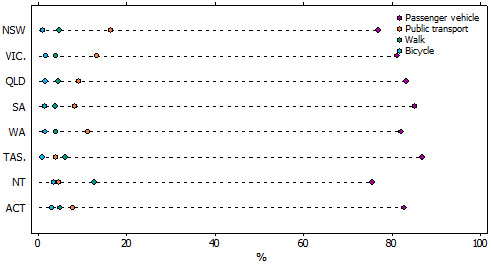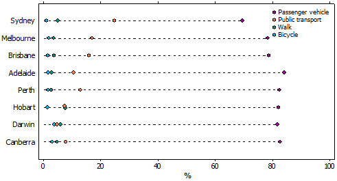 (b) Excludes vehicles with registration less than one month before the census date. (c) Vehicles for which registration expired prior to 31 March were removed by processing systems used before Motor Vehicle Census 2008. Approximately 2% of ACT registrations have been omitted. The error has little impact on ACT annual fleet growth rates. Source: ABS 2013 Motor Vehicle Census, Australia, 2013 Getting to work According to the 2011 Census of Population and Housing, Tasmania had the largest proportion of people using a passenger vehicle as part of their transport to get to work (87%), followed by Queensland (85%) and then the ACT (83%, consisting mainly of people in Canberra). While New South Wales had the second smallest proportion they had the largest proportion of people using public transport , such as trains, buses, and ferries to get to work (16%) ALL METHODS(a) OF TRAVEL TO WORK(b) BY STATE AND TERRITORIES, 2011 (a) More than one form of transport may be specified. (b) Of those who travelled to work. Source: ABS 2011 Census of Population and Housing and in capital cities? In 2011, Sydney had the lowest passenger vehicle use to get to work (70%) and the highest public transport use (25%). Conversely, Adelaide had the highest passenger vehicle travel to work (84%) and the second lowest proportion of people walking to work (2.9%). ALL METHODS(a) OF TRAVEL TO WORK(b) BY CAPITAL CITY, 2011 (a) More than one form of transport may be specified. (b) Of those who travelled to work. Source: ABS 2011 Census of Population and Housing LOOKING AHEAD Passenger vehicles have provided a convenient way to travel and allowed us greater freedom. More Australians are driving, with many using it as their main method of transport to get to work and study as well as social activities. With an increasing number of passenger vehicles, this high level of passenger vehicles use is likely to continue. ADDITIONAL TOPICS EXPLANATORY INFORMATION