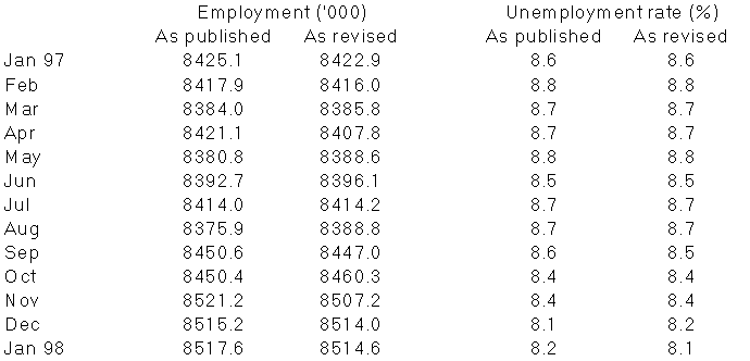 Revised monthly seasonally adjusted estimates of employment and the unemployment rate for the period January 1997 to January 1998 are: