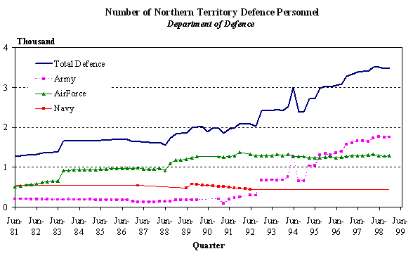 In addition, consultation with staff within DOD and DCSC has helped to shed light on the strengths and weaknesses of the respective defence data. The main features of our investigation are as follows: 1. The interstate migration model assumes for every one Medicare mover there is effectively between one and three actual movers. This ratio or expansion factor recognises that the movement of a family or household may be captured only partially by Medicare enrolments. The expansion factors are complicated by the fact that military personnel may be covered by the military's own 'on-base' health provision. 2. DOD data by 'place of posting' provides an internally consistent time series back to June 1981 for all States/Territories. This data suggests that NT is the only State/Territory to have increased its number of defence personnel from 1996 to 1998 (Figure 1). Figure 1.