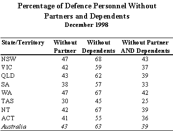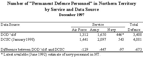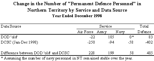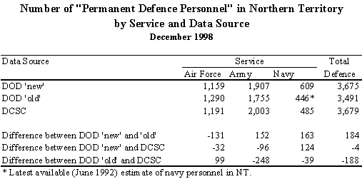 The lower intercensal discrepancy in the NT from using a 3 month lag can be attributed to high net migration Medicare figures (approximately 500 persons) to the NT in the September 1996 Quarter. In using the lagged model, these Medicare data are not referenced post 30 June 1996. Instead, this quarter is to estimate interstate migration in the June 1996 quarter and plays a significant role in decreasing the estimated intercensal discrepancy in the 1991 to 1996 intercensal period. This appears more intuitive, with the 0 month lag suggesting that people would move to the NT in the September quarter, at the end of the dry season. Thus, while Medicare address data suggest that address information is regularly updated, the data are not clear. Furthermore, it seems intuitive that an average lag of three months between moving and registering is more probable than no lag at all. As such, the decision was to proceed with using lagged Medicare data. The choice of a 3 month lag Given that the current ABS publication schedule and the fact that the ABS receives Medicare data quarterly from the HIC, only lags of 3 months or 0 months can be accommodated. The 3 month lag was chosen in preference to the 0 month lag as it was thought to be more intuitive and produced a lower intercensal discrepancy for the 1991-96 intercensal period (see previous table). Despite the difficulty in implementing longer lags, lags of both 6 months and 12 months were also investigated during preliminary investigations, with intercensal discrepancy generally minimised with lags of 3 and 6 months. A2.3 The impact of the backdating adjustment from 6 August 1996 to 30 June 1996 The estimated resident population for 30 June 1996 was originally calculated by adjusting the 6 August 1996 (Census date) estimated resident population for births, deaths, interstate migration and international migration during the intervening time. As part of this process, interstate migration for the period between 30 June 1996 and 6 August 1996 was estimated using the previous interstate migration model (as detailed in 2.1.2 in the proposal). As such, it is necessary to ensure that revisions made to post-30 June 1996 interstate migration are consistent with the method used to backdate the 6 August 1996 estimated resident population back to 30 June 1996. This is achieved by only introducing the proposed method from 6 August 1996 instead of 30 June 1996 (see below). A2.4 The use of Defence data, in relation to both the data sourced and the way it is used NT Treasury expressed concern over both the method used to adjust the estimated interstate migration on the basis of data provided by the Department of Defence, and the quality of the data provided by the Department of Defence. While it was not possible to investigate these concerns in sufficient detail and still implement the proposed model by December 1999, ABS provided a commitment to investigate NT Treasury's concerns with the intention that a satisfactory outcome would be achieved before the release of the December 1998 population estimates (due June 1999). A2.5 Summary of changes made to the proposed model On the basis of the comments received, the following adjustments were made to the proposed model for estimating interstate migration: 1. The cap of 2.0 for expansion factors was removed. 2. An adjustment was introduced to allow for the fact that the population estimates had been backdated from 6 August 1996 to 30 June 1996 using the 1991 to 1996 model. In addition, a commitment was made by ABS to further investigate the method used to adjust the estimated interstate migration on the basis of data obtained from the Department of Defence. The results of this investigation are detailed further in Appendix 3. APPENDIX 3: Estimating Interstate Migration: Proposed Adjustment for Defence Personnel Following the circulation of the ABS discussion paper Proposal for a Revised Method of Estimating Interstate Migration (August 1998) and comments received, particularly from NT Treasury, the ABS has undertaken further analysis of defence data. In summary, the ABS proposes: