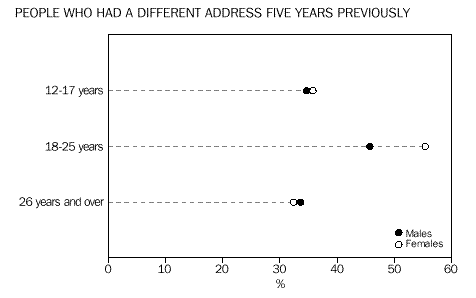 Young females in South Australia were more likely to have moved than young males. In 1996, 51% of young women reported living at a different address from five years ago, compared with 42% of young men. For the older population, 32% of females and 34% of males were living at a different address from five years ago.