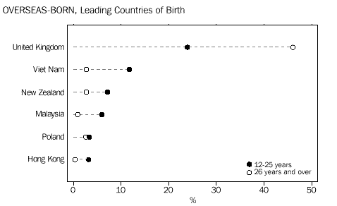 More than 37% (10,130) of overseas-born people aged 12-25 years originated from the main English-speaking countries (Canada, Ireland, New Zealand, South Africa, the United Kingdom and the United States of America). Among older people (aged 26 years and over), over one-half (52% or 138,515) had been born in the main English-speaking countries.