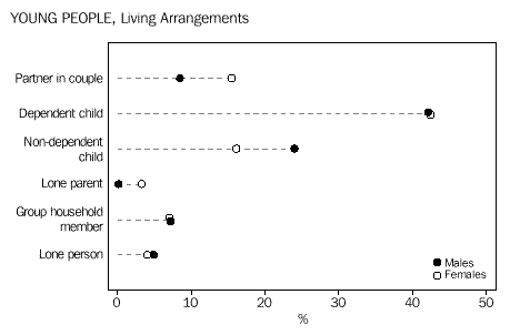 Just over 42% of 12-25 year-olds were living with their parents as dependent children. Another 24% of young males, and 16% of young females, were living as non-dependent children with their parents. Young women were more likely than young men to have moved from the family home, forming partnerships and their own families (19% compared with 9% of young males).