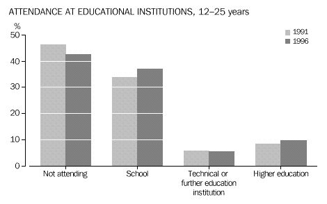 Between 1991 and 1996 the proportion of all young people who were attending school increased from 34% to 37%. Over the same period, the proportion of young people attending higher education institutions increased from 8% to 10%.