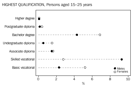 While similar proportions of young males (18%) and females (19%) held post-school qualifications, the level of qualification varied between the sexes. The most common qualifications held by young males were skilled vocational qualifications (9%), followed by bachelor degrees (4%). For young females, the most common qualifications were bachelor degrees (7%), followed by basic vocational qualifications (5%).