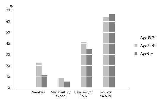 Compared with results from a previous survey in 1989-90, the recent survey indicates an increase in healthier lifestyles by adult Australians (table 8). The proportions of adults who smoked (24%), did little or no regular exercise (63%) or who drank alcohol at medium or high risk levels (8%) were lower in 1995 than in 1989-90. Similarly, the proportion of the population who where overweight or obese also showed a slight decline. Of those who reported their weight and height in the 1995 survey, 35% were overweight or obese, down from 38% in 1989-90.