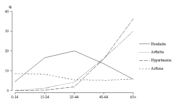 Headaches were the most commonly reported recent illness condition, experienced by an estimated 11% of males and 15% of females (table 2). Other frequently reported recent illness conditions were arthritis (8.5%), hypertension (8.3%) and asthma (6.5%).