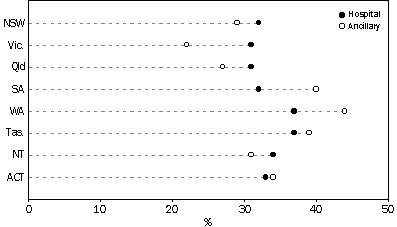 Levels of private health insurance varied between States and Territories, from a low of 35% of the population having private insurance in Victoria and Queensland to a high of 47% in Western Australia. While the level of hospital cover (with or without ancillary cover) was similar across the States and Territories, the level of ancillary cover (with or without hospital cover) differed, ranging from a low of 22% in Victoria to 44% in Western Australia.