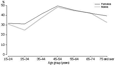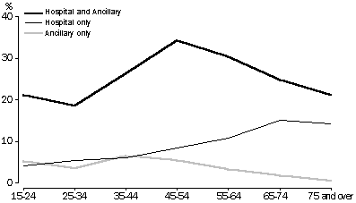 Levels of hospital and ancillary cover were similar to each other in the younger age groups. Combined hospital and ancillary insurance coverage increased up to the 45-54 year age group, then declined in older age groups. The level of combined hospital and ancillary cover decreased by 13 percentage points from a peak of 34% of those aged 45-54 to 21% of those aged 75 and over. The level of ancillary only cover also declined with age. In contrast, coverage by hospital only insurance increased with age, from 5% of those aged 15-24 years, to 15% of those aged 65-74 years.