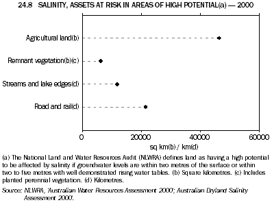 Altered hydrological regimes The clearance of native vegetation and commercial changes in hydrological cycles have serious implications for land management and biodiversity. Vegetation clearance changes the water balance of an area and this may lead to fundamental changes in the local soils and climate, as well as the local water table and its chemical composition. Australia's soils are old and shallow and are susceptible to degradation by agricultural activities. Even in a continent as dry as Australia, salinity occurs when there is too much water. Salinity occurs when the water table rises, bringing natural salts to the surface (in sufficient quantity, these salts are toxic to most plants). In the quest to prepare Australian soils for agriculture, trees were massively cleared. Yet trees played a crucial role in maintaining the water balance in the ancient soils. It was the success in clearing trees that led to the development of dryland salinity. Irrigated-land salinity is caused by a similar effect - the application of excess water to land causes the water table to rise. European farming practices which replaced native vegetation with shallow-rooted crops and pastures have caused a marked increase in the expression of salinity in land and water resources. The impacts of salinity are also wider than lost agricultural production and include damage to water resources, biodiversity, pipelines, houses and roads. Salinity harms Australia’s biodiversity (primarily through loss of habitat), while saline water damages bitumen and concrete. In 2000, 1,600 kilometres (km) of rail, 19,900 km of road, 68 towns and 80 important wetlands were at risk of damage from salinity (graph 24.8). The National Land and Water Resources Audit in 2001, estimated that about 5.7 mill. ha (not all of it agricultural land) had a high potential for the development of dryland salinity through shallow or rising water tables. In 2002, 20,000 farms and 2.0 mill. ha of agricultural land were reported by farmers as showing signs of salinity. Dryland salinity also threatens biodiversity, through loss of habitat on land and in water. Areas near water are often worst affected because they occupy the lowest parts of the landscape where saline groundwater first reaches the surface. Areas of remnant and rehabilitated native vegetation are under threat in Western Australia, South Australia, New South Wales and Victoria. In the Western Australian wheat belt, salinity has caused a 50% decrease in the number of wetland bird species and 450 plant species are threatened with extinction through salinity. Natural resource management Australia's salinity problems are the focus of the $1.4b joint Australian Government and State Government National Action Plan for Salinity and Water Quality, endorsed in 2000 by the Council of Australian Governments. Under the plan, 21 priority regions have been targeted and governments and communities are working together to prevent, stabilise and start to reverse trends in dryland salinity, and improve water quality. Additionally, the Natural Heritage Trust (NHT) was set up by the Australian Government in 1997 to help restore and conserve Australia's environment and natural resources. Its funding has been extended until 2007-08 making it a $3.0b investment. Thousands of community groups and organisations have received funding for environmental and natural resource management projects. The NHT provides funding for environmental activities at a community level (through the Australian Government Envirofund), a regional level, and a national/state level. More than nine out of ten farmers reported undertaking some form of natural resource management (NRM) activity during 2004-05. Nationally, weed and pest management were the most common NRM activities farmers undertook, with 80% of agricultural establishments undertaking activities to either prevent or manage weeds. Land and soil and native vegetation issues were other natural resource management issues reported by farmers. Native vegetation management also formed an important part of NRM on farms in 2004-05. Approximately 63% of agricultural establishments which reported the presence of native vegetation undertook some form of native vegetation management activities during the year. Although Australia’s biodiversity continues to be threatened by many factors, much is being done to protect native flora and fauna. One such measure is the protection of land and sea areas (and their biodiversity) inside conservation reserves. National parks and other protected areas are areas of land and/or sea especially dedicated to the protection of biodiversity and other natural and cultural resources. They are established under Commonwealth, state or territory laws or other legal means. All governments participate in the development of a comprehensive, adequate and representative national reserve system as part of Australia's obligation under the United Nations Biodiversity Convention established in 1993. Most national parks and other protected areas in Australia are declared and managed by state and territory governments although, during the last decade, some protected areas have been established which are managed by conservation or other groups. Declaration and management of Indigenous protected areas - Indigenous-owned land that is managed to protect its natural and associated cultural values - commenced in 1998. The Australian Government declares and manages parks and reserves on land owned or leased by the Commonwealth, in Commonwealth waters and on Indigenous land leased to the Commonwealth. Australia also has international obligations concerning its protected land, such as World Heritage listed sites and Ramsar wetlands. World Heritage sites are nominated areas that have outstanding natural and/or cultural values. Australia has 15 World Heritage sites listed for natural values, with Kakadu National Park, Uluru-Kata Tjuta National Park, Willandra Lakes Region and t