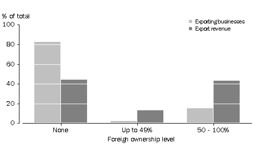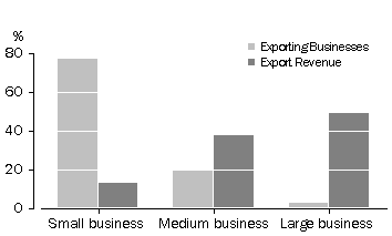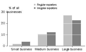 For some tables, size groups are combined because sample sizes do not allow the full dissection to be provided. In addition to the employment size tables, table 1.5 also provides data classified by turnover size. SECTION 1 CHARACTERISTICS OF AUSTRALIAN EXPORTERS This section provides an overview of the structural characteristics of exporters and how they compare to non-exporters. The extent to which businesses are regular exporters as opposed to irregular is also examined along with some indications of trends in business characteristics from 1994-95 to 1997-98. BUSINESS SIZE There are several alternatives for grouping businesses by size. ABS has adopted total employment as the basis for classifying non-agricultural businesses by size and the size categories used in this publication are generally consistent with other ABS business size classifications (see Introduction for more details). As well as presenting data classified by employment size groups, table 1.5 also provides details by turnover size group. Most exporters are small businesses but export revenue dominated by large businesses During 1997-98, in the industries covered by the survey, there were an estimated 21,800 exporting businesses in Australia which represented 4% of all businesses. These businesses generated over $60 billion in export revenue. Of the 21,800 exporting businesses, 77% (16,600) were small businesses (i.e. employing less than 20 people). While small businesses made up the majority of exporting businesses, they only accounted for 13% of total export revenue. The 700 large exporting businesses accounted for 49% of export revenue while the 4,500 medium businesses (21% of the total) accounted for 38% of total revenue. Exports of goods versus services Of the 21,800 exporting businesses, 17,800 (82%) exported goods, while a further 4,000 (18%) exported services only. (See note in the Introduction relating to the limited coverage of the export of services). Service exporting firms were mostly in the small business sector (88% of the total) with almost 3,500 small firms exporting services. EXPORTING BUSINESSES AND REVENUE EXPORTING EXPERIENCE Not all exporters are continuously involved in exporting; for some it is a short term activity; for others it is intermittent behaviour. To illustrate the transient nature of many of Australia's exporters, table 1.2 categorises these businesses which operated in all four years of the survey (1994-95 to 1997-98) into four groups according to their exporting activity over the period. The first group is the 'regular exporters' - those that exported in each of the four years; the second group is the 'irregular exporters' - those that exported in at least one year but not all four years; the third group 'all exporters' is the sum of the first two groups, while the final group, the 'non-exporters', are those that did not export at all during the four years. Table 1.3 shows the level of exports for businesses in each of the exporter experience categories. Regular exporters versus irregular exporters An examination of the four year panel of businesses reveals that: 7% of all businesses that operated for all four years exported at some stage during the period;