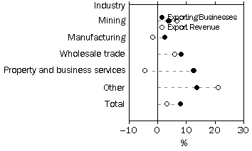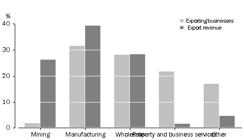 The regular exporting businesses, which made up 36% of the four year panel of exporters, were the major exporters averaging over $6 million in export revenue per year. This represented an average export intensity of 27% . (Export intensity is defined as the value of exports as a percentage of total income and is sometimes referred to as the export ratio.). Overall, the irregular exporting businesses averaged $457,000 in export revenue each year they exported, with an average export intensity of 9%. Of the irregular exporters, most exported in only one of the four years. There were 7,200 businesses (57%) exporting in only one year, while 3,800 (26%) exported in two of the four years and 3,500 (26%) exported in three of the four years. REGULARITY OF EXPORTERS - 1994-95 TO 1997-98 Born globals Table 1.3 also shows details of the so called 'born globals' (those businesses that commenced exporting in their first year of operation). In the survey, new start-up businesses were identified in 1995-96, 1996-97 and 1997-98. During the three years, an estimated total of 224,000 new businesses commenced operation with almost 3,300 (1.5%) of these exporting in their first year of operation. These businesses tended to be significant exporters, averaging $2.5 million in export revenue in their first year of operation and recording an average export ratio of 25%. GROWTH IN THE EXPORTER COMMUNITY Over the three year period 1994-95 to 1997-98, the number of exporting businesses increased 26% from 17,300 to 21,800, which represents an annual average growth rate of 8% per year. Over the same period, export revenue increased from $54.6 billion to $60.2 billion (10%) which represents an annual average growth rate of 3% per year. Small business leads the way Over the three years, growth was strongest in the small business sector, particularly in micro businesses (those employing 1-4 people). The number of exporting micro businesses increased from 5,500 in 1994-95 to 7,500 in 1997-98 (37%) representing an average increase of 11% per annum. Other small businesses (those employing more than 4 but less than 20 people) also recorded strong growth rates with numbers of exporting businesses increasing at an average of 9% per annum over the three years. In terms of exports revenue, levels for total small business increased from just over $5 billion in 1994-95 to $7.6 billion in 1997-98, representing an average growth rate of 15% per annum. Growth rates for medium businesses were less pronounced with the number of exporters increasing at an average of 4% per annum to almost 4,500 businesses and export revenue for the sector increasing at an average 5% per annum to $23.1 billion in 1997-98. In the large business sector there was a slight decline in the number of exporters over the three years, dropping from 775 in 1994-95 to 700 in 1997-98 (an average annual decline of -3%). Over the same period revenue also dropped marginally from $29.7 billion to $29.5 billion. This fall in exporting activity by large business was during a period when the total income of large businesses increased by 7% per annum. Large business' share of total export revenue also dropped over the period from 54% in 1994-95 to 49% in 1997-98. EXPORTERS BY TURNOVER SIZE GROUP Table 1.5 provides details of the number of exporters and export revenue by turnover size group for 1997-98. Again the smaller size categories dominate in terms of number of businesses with just over half (51%) of the 1997-98 exporters recording turnover of less than $1 million. These 'low turnover' businesses only accounted for 1% of total export revenue. At the other end of the scale, the 840 exporters with turnover of $50 million or more accounted for 76% of total export revenue. EXPORT INTENSITY Table 1.6 again categorises the exporting businesses that operated for the four years of the survey into three groups; regular exporters, irregular exporters and all exporters. Then as a separate group, the born globals are presented to examine the export intensity for each category. Most businesses which exported generated only a small share of their total income from exports. Of the 4% of Australian businesses that were exporting during 1997-98, over 63% of them were generating less than 10% of their total income from exports. This intensity measure is sometimes referred to as their export ratio. A further 23% of exporting businesses recorded an export ratio between 11% and 50%, while only 13% recorded a majority of their income as being sourced from exports (i.e. a ratio of more than 50%). Looking at the regular exporters (those that exported in each of the four years of the survey), there is a high percentage of businesses (24%) that recorded an export ratio of more than 50%. Of the irregular exporters, on the other hand, only 8% recorded an export ratio of more than 50% in the years that they exported. Born globals generally recorded similar intensity levels to the regular exporters, with 59% of businesses recording an export ratio of 10% or less and 22% recording a ratio of 50% or more. The average export ratio did not vary significantly across the different business size groups, although micro businesses (those employing 1-4 people) tended to have more businesses with an export ratio of more than 50% in each of the categories, regular, irregular and born globals. INDUSTRY DIMENSION Tables 1.7, 1.8 and 1.9 provide an overview of the industry coverage of Australian exporters. However, as noted in the Introduction there are certain exclusions from the BLS that should be kept in mind. Firstly, the survey excludes non-employing businesses, government enterprises as well as the Agriculture, Communication services, Education and Health and community services industries. Also, it does not cover exports of travel, freight and other transportation services. Proportion of all exporters Across the industries covered, the Manufacturing industry with almost 6,900 exporting businesses accounted