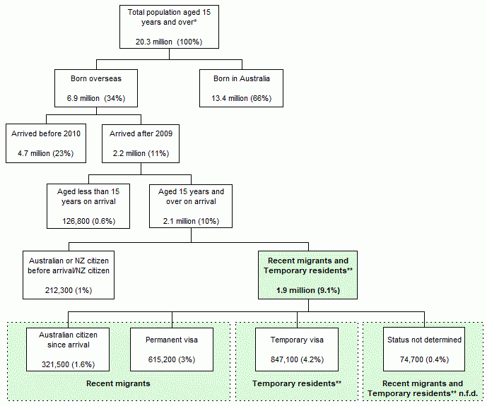 The following diagram shows the estimates for the Australian population aged 15 years and over, by migration status.
