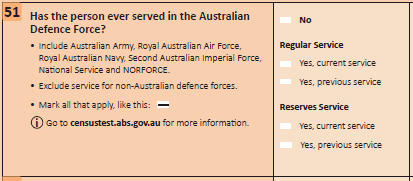 Example question from 2019 Census Test: Has the person ever served in the Australian Defence Force?