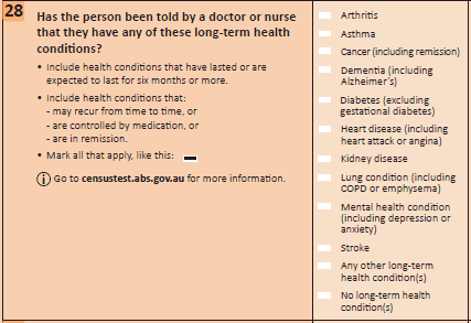 Example question from 2019 Census Test: Has the person been told by a doctor or nurse that they have any of these long-term health conditions?