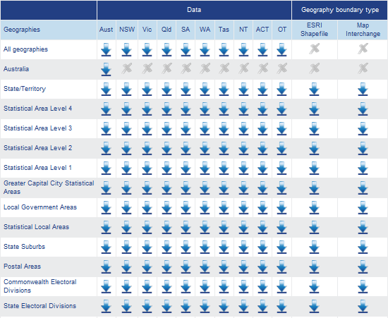 Once you have made these selections, a table will appear. The table below shows the options available after selecting short header descriptor type. By selecting a down arrow, you can download a DataPack file for the geographic level and geography boundary file you require, for all of Australia or for a state or territory. DataPacks for Basic Community Profile with short header |