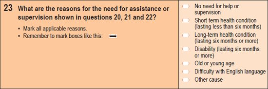 | Core Activity Need for Assistance (ASSNP)The Census 'Core Activity Need for Assistance' (ASSNP) concept was developed for the 2006 Census to indicate the disability status of people in Australia according to geographic area, and for small groups within the population. Of all ABS collections of disability data, only the Survey of Disability, Ageing and Carers (SDAC) is considered to comprehensively measure disability populations, and to provide rates of prevalence at the national and state levels. The Census concept ASSNP is related to the 'disability status' information collected in the SDAC. The purpose of the Census is to identify people with a 'profound or severe core activity limitation' using similar criteria to the SDAC. This population is defined as people with a disability who need assistance in their day to day lives with any or all of the following core activities - self care, body movements or communication. The non-response rate for the Census variable ASSNP was 5.7% in 2011 compared with 6.4% in 2006. More information is available from the 2011 Census non-response quality statement. The Census uses a set of four questions to capture 'Core Activity Need for Assistance' (questions 20 to 23 on the Census Household Form). Responses to the questions are captured automatically from mark box responses where the risk of processing error is low. Sample checks are undertaken to ensure an acceptable level of quality. Responses to the individual questions are then combined to produce the single variable, Core Activity Need for Assistance. It is not possible to obtain information about need for assistance for the core activities separately. Users wanting more comprehensive information about the disability status of people in Australia should instead refer to the publication Disability, Ageing and Carers, Australia: Summary of Findings, 2009 (cat. no. 4430.0). Despite the conceptual consistency of the measures in the Census and SDAC, abbreviating the set of questions used to collect data on disability, as required for the Census, reduces the number of people who can be classified as having a disability or to a particular level of disability, depending on the concept being collected. The publication, ABS Sources of Disability Information, 2003-2008 (cat. no. 4431.0.55.002) examines the different ABS sources of disability data. More information on ASSNP is available in the 2011 Census Dictionary (cat. no. 2901.0). Questions 20 to 23 as they appeared on the 2011 Census Household FormFour Census questions are used to capture data for this variable.Text only versions of these questions are available. Back to Person classification |