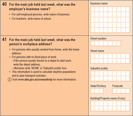 | Place of WorkPlace of Work (POWP) data provide information on where employed people over 15 years of age worked in the week prior to Census Night. POWP is determined from written responses to the 'Business name' and 'Workplace address' questions about the main place of work last week. It is coded to geographic areas known as Destination Zones (DZNs). DZNs are defined by the relevant State Transport Authority (STAs) from each state or territory, in conjunction with the ABS. These questions were first asked in the 1971 Census. Data for POWP, Place of Usual Residence (PURP) and Method of Travel to Work (MTWP) can be cross-classified to examine movements of people to and from work, to analyse transport patterns and assist in the planning for transport systems. Place of Work is a hierarchical field and for 2011 can be broken into State, SA2 and Destination Zone. The POWP variable replaced Journey to Work (JTW) in 2006. POWP is determined from written responses to 'Business name' (Question 40 on the Census Household Form) and 'Workplace address' (Question 41). Questions 40 and 41 as they appeared on the 2011 Census Household Form A text only version of these questions is also available. Geographic changes with the ASGS and ASGC and hierarchy aggregationsPlace of work data for the 2011 Census has been 'dual coded' to both ASGS and ASGC using an index that derives Destination zone (DZN), SA2, and SLA. This is achieved by using firstly an ASGC index to derive SLA (and consequently LGA) and secondly an ASGS index to derive Destination Zone and the associated SA2.For the 2011 Census, Destination Zone boundaries aggregate precisely to SA2 boundaries based on the new ASGS. It should be noted that for a given response, it may be possible for an SLA but not an SA2 to be obtained, or vice versa. Since LGAs are aggregates of one or more SLAs, an LGA can then be derived from the SLA. Place of Work SLA/LGA data have been provided on the ASGC basis and are available in products such as 2011 TableBuilder and the Working Population Community Profile. Further information on these correspondences is available from the Geography Portal. Dual coding correspondences