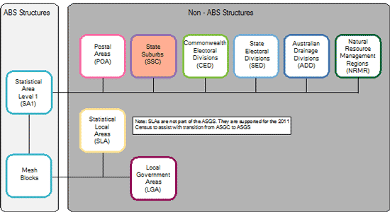 What are Gazetted Localities?Gazetted Localities are the officially recognised boundaries of suburbs (in cities and larger towns) and localities (outside cities and larger towns). Since 1996 these boundaries have been formalised for most areas of Australia through a program coordinated by the Committee for Geographical Names in Australasia (CGNA), under the umbrella of the Intergovernmental Committee on Surveying and Mapping (ICSM).Gazetted Localities cover most of Australia. Presently there remain areas of rural South Australia and rural Australian Capital Territory that are undefined. Various islands offshore from New South Wales, Victoria and Tasmania and some inshore water areas and islands are also undefined. Because Gazetted Localities are a well understood and easily collected component of an address, they can be used to link statistical data to a geographic area for spatial analysis. The ABS provides coding indexes that can be used to link data collected with a suburb or locality to standard ABS geographic areas – for example, linking Statistical Local Areas (SLAs) within the Australian Standard Geographical Classification (ASGC) to Statistical Areas Level 2 (SA2s) within the Australian Statistical Geography Standard (ASGS). This enables data to be compared with a range of other ABS data released on both the ASGC and ASGS. For a full list of available coding indexes, please view the ‘Correspondences’ chapter of the ABS Statistical Geography website: https://www.abs.gov.au/geography. What are State Suburbs and what is their purpose?State Suburbs (SSCs) are an ABS approximation of Gazetted Localities as described above. SSCs are approximated using one or more Statistical Areas Level 1 (SA1s) from the ASGS. SA1s are the smallest geographic areas on which most 2011 Census data are released.SSCs are created to enable the release of ABS data on areas that, as closely as possible, approximate Gazetted Localities. SSCs cover most, but not all, of Australia, as described under the Gazetted Localities heading above. Diagram 1 illustrates how SSCs (in orange) relate to other ABS and non-ABS structures. Diagram 1 ASGS non-ABS structures and 2011 SLA How were SSCs created?The boundaries and statistics produced for SSCs were constructed from whole SA1s.Each SA1 was allocated the name of the Gazetted Locality that was estimated to contain the highest proportion of ‘population’ from that SA1. As a result, there are Gazetted Localities which do not appear in the SSC classification. This occurs in cases where:
